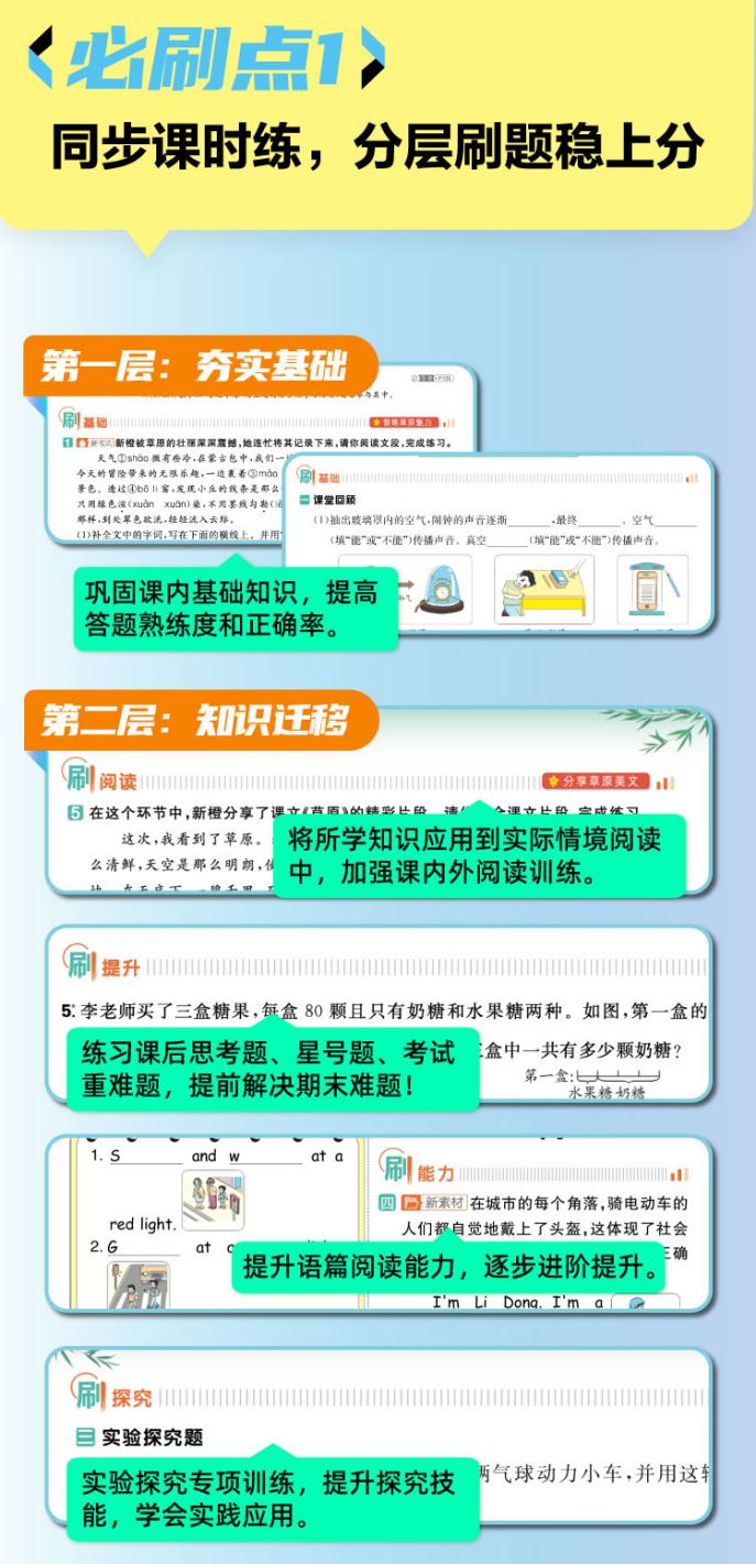 情境卷+真題卷:實(shí)戰(zhàn)模擬,期末復(fù)習(xí)“一步到位”。除了主書和《狂K》插冊(cè),還配套情境式評(píng)價(jià)卷——日常練單元、專項(xiàng)補(bǔ)短板、考前模實(shí)戰(zhàn),從基礎(chǔ)到?jīng)_刺的所有練習(xí)場(chǎng)景全覆蓋,再也不用東拼西湊買卷子。