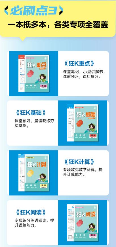 中等生需要突破瓶頸,成績穩(wěn)步向上。主書的難度與題量既不重復(fù)簡單題浪費(fèi)時(shí)間,也不超綱為難孩子,剛好能在鞏固基礎(chǔ)的同時(shí),穩(wěn)步提升能力。再加上《狂K閱讀》《狂K難點(diǎn)》《狂K重點(diǎn)》等專項(xiàng)插冊(cè),針對(duì)性解決閱讀理解、數(shù)學(xué)重難點(diǎn)等“提分?jǐn)r路虎”,助力孩子突破成績天花板。